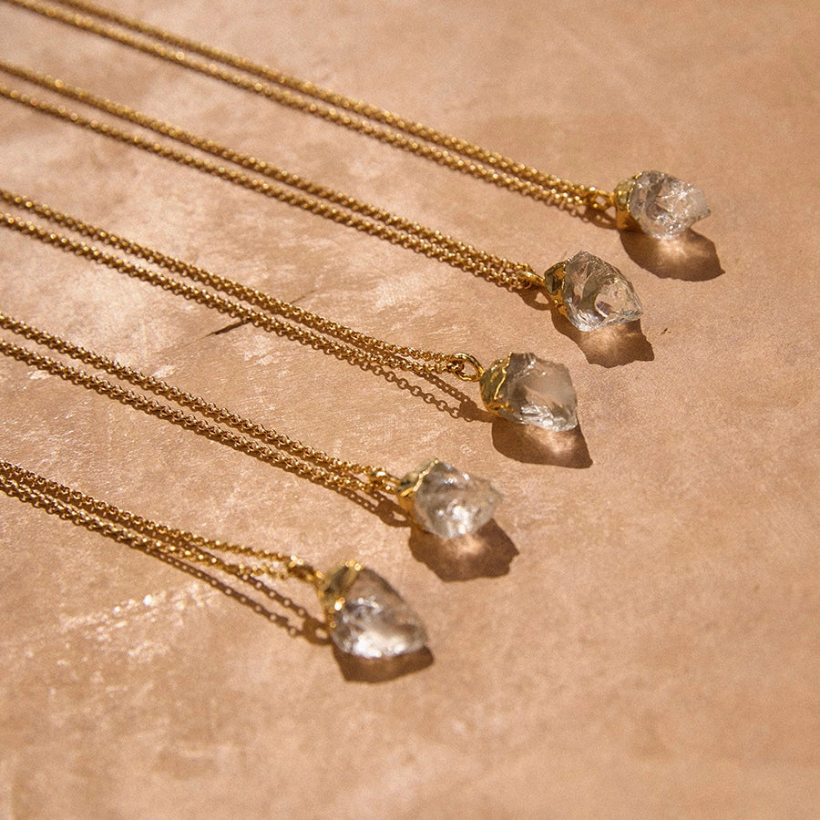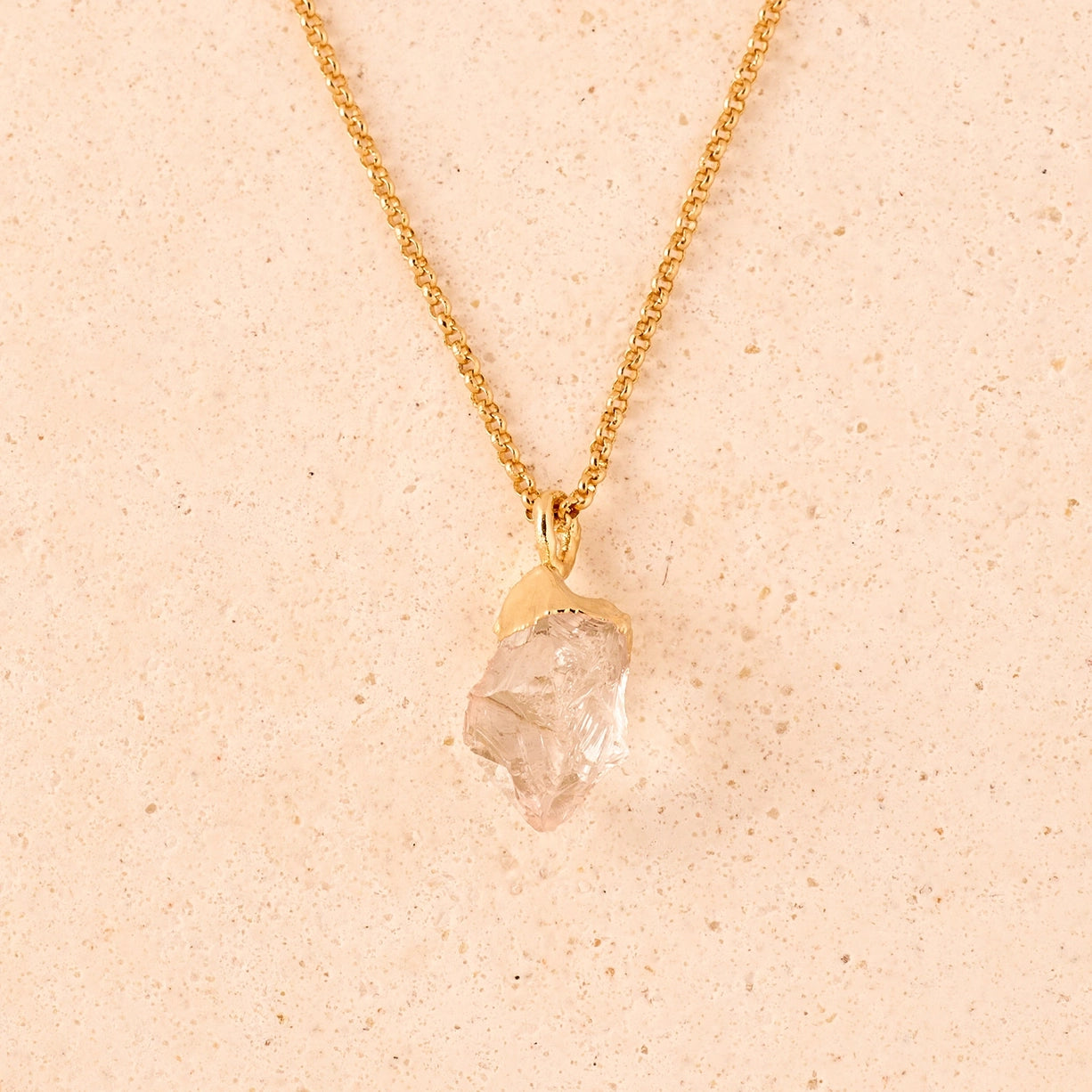 Ein klarer Quarzanhänger, gehalten von einer schlanken Kette. Die unregelmäßige Goldeinfassung, von Hand aufgetragen, umhüllt den Kristall wie flüssiges Metall und betont seine rohe, organische Schönheit.